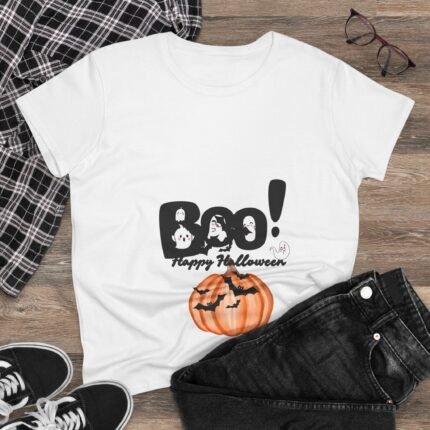 Halloween Women’s Cotton Tee | Fun Boo! Pumpkin Shirt | Casual Fall Wardrobe, Gift for Halloween Party, Spooky Season Tee